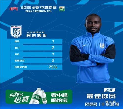 中超:阿奇姆彭获评最佳 半岛晨报 2026-03-25 11:10:33 中超第三轮最佳球员评选结果出炉,大连英博外援阿奇姆彭当选。在与上海海港的比赛中,他攻入制胜一球,帮助球队取得赛季首胜。半岛晨报、39度视频记者隋海涛 中超隋海涛中超联赛弗兰克·阿奇姆彭 上一篇: 津门虎夏窗补强中卫势在必行球迷推荐吴少聪入队,以官宣为准下一篇: 于根伟:家里人都劝我离开,但我还是对津门虎队有责任有感情