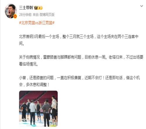 根据媒体人三土带刺报道:“小曾(曾凡博),还是膝盖问题,一直在积极康复,近期不会打!还是那句话,借这个机会,多休息和调整!”